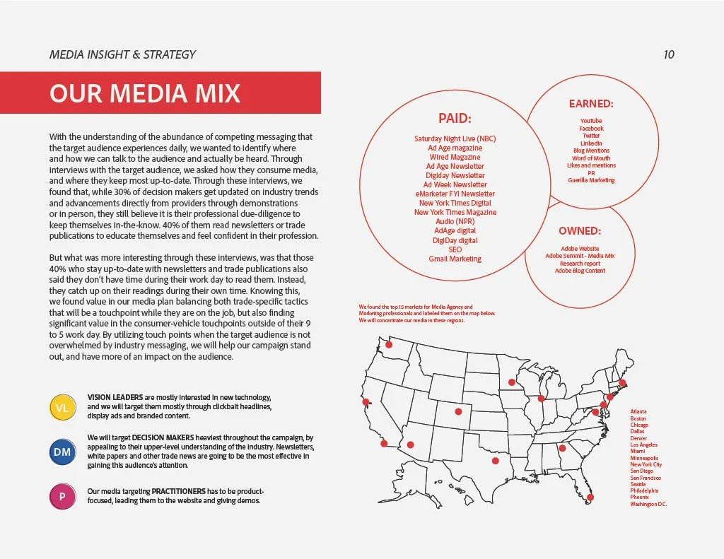 Through an honors capstone program, a group of 9 KU seniors were chosen to participate in the National Student Advertising Competition. Through this, we were asked to raise awareness of Adobe Experience Cloud for Advertising as the leading, independent adtech provider with the target market being companies and agencies spending $1 Million+ annually on digital advertising. Adobe’s goal was to grow their adtech business by 25 percent with a $4 million campaign budget.